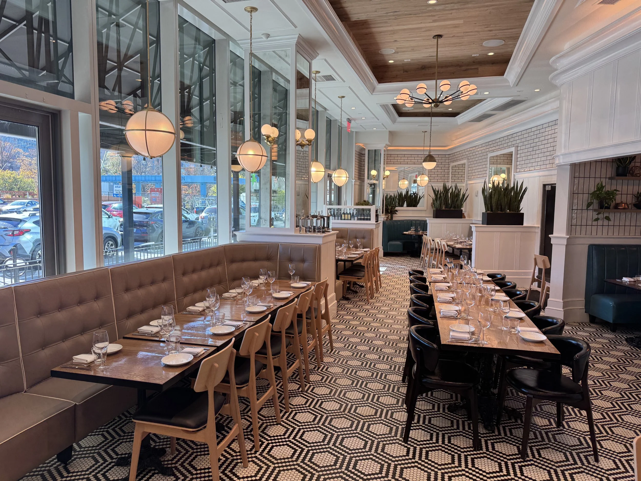 Our banquette table and center tables can be combined in our Main Dining room as two long tables side by side to each other. Perfect for groups of 16 to 30 guests for a seated dinner.